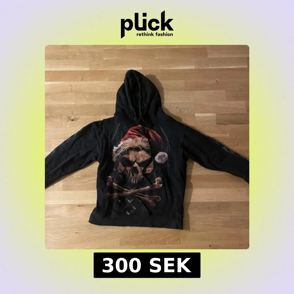 Svart hoodie med stor dödskalle och korslagda ben på framsidan, båda med tomteluva i rött och vitt. Baksidan har en dödskalle med tomteluva och coola ringar. Ärmarna har tryckta flames. Huva med snörning och känguruficka framtill. Nypris 699kr, endast använd 2 gånger