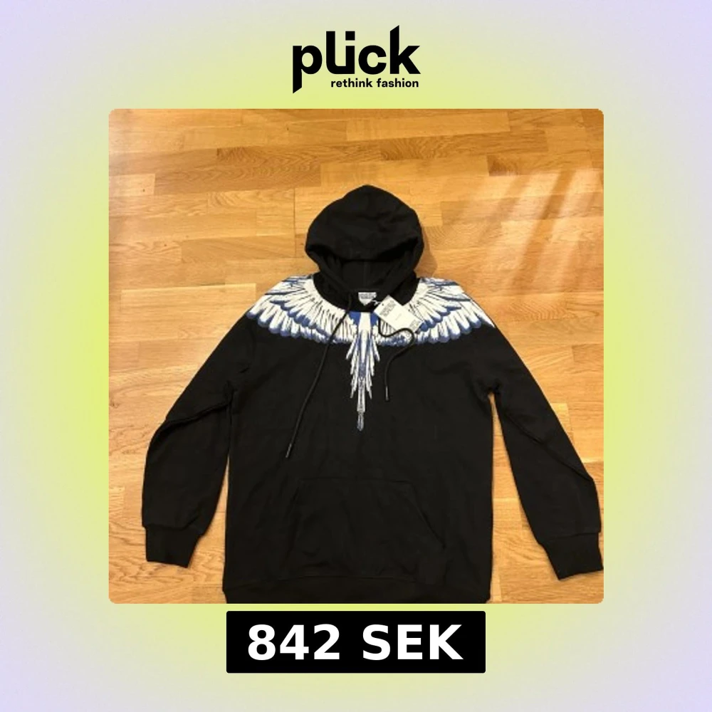 Svart hoodie från Marcelo Burlon med ikoniskt vingtryck i vitt och blått över axlar och bröst. Tröjan har huva med snörning och känguruficka framtill. Tillverkad i mjuk bomull, perfekt för dig som vill sticka ut med en unik streetstyle.