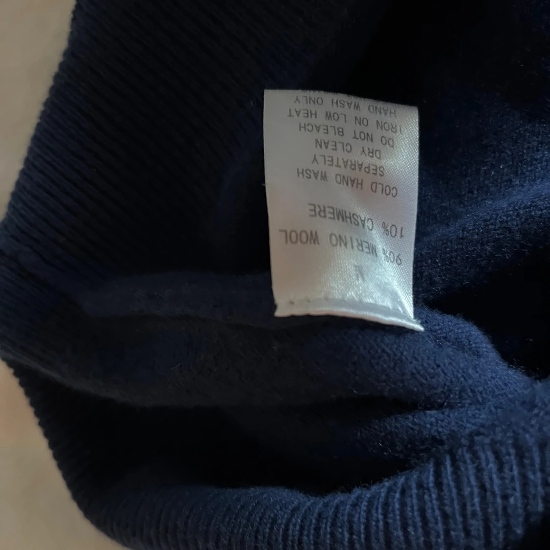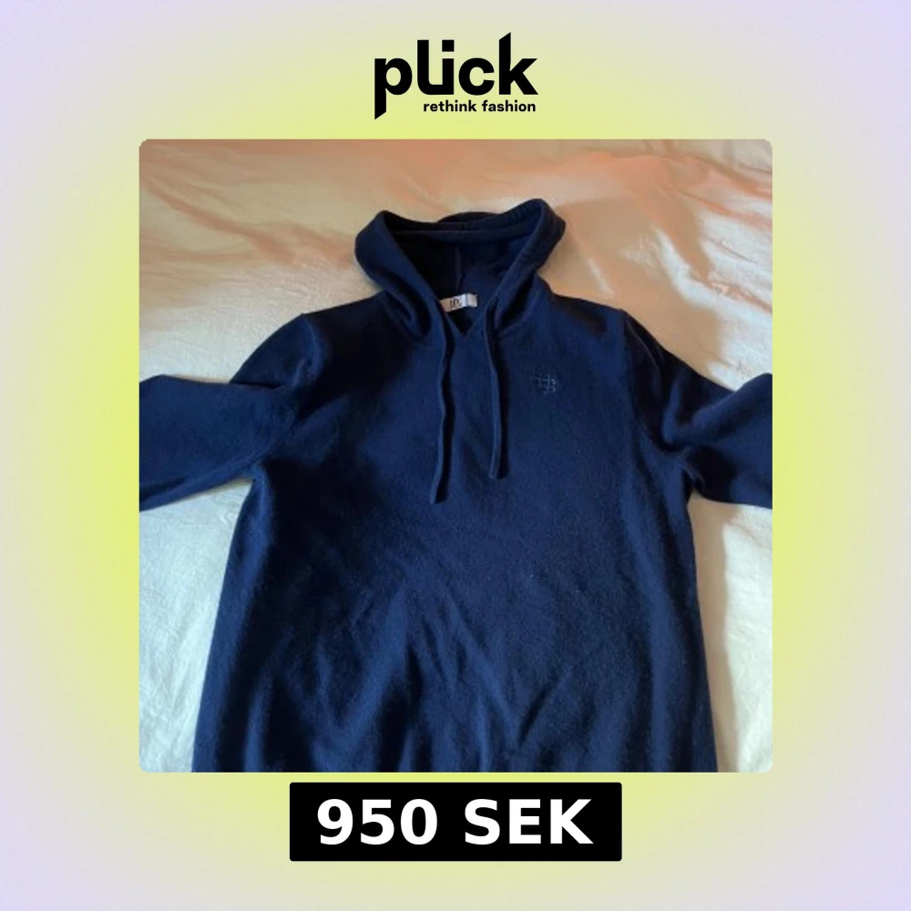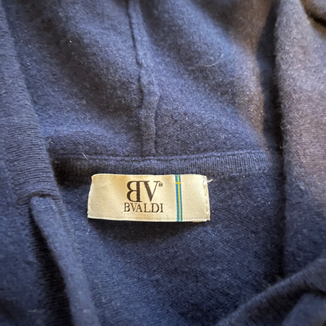 Mysig marinblå hoodie från Bvaldi i en lyxig mix av 90% merinoull och 10% kashmir. Tröjan har huva med snörning och broderad logga på bröstet. Perfekt för dig som vill ha en stilren och skön look under kyliga dagar. Inga tecken på användning. Kvitto finns köpt i somras