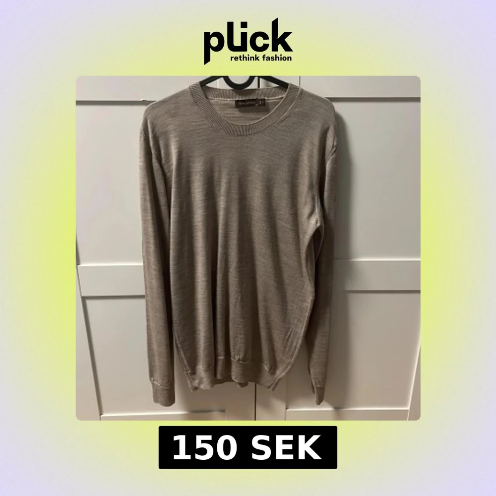 Snygg beige tröja från Oscar Jacobson i mjuk merinoull. Klassisk rund halsringning och långärmad modell. Tillverkad i Italien och passar lika bra till jeans som till chinos. Säljs för att den är för liten för mig