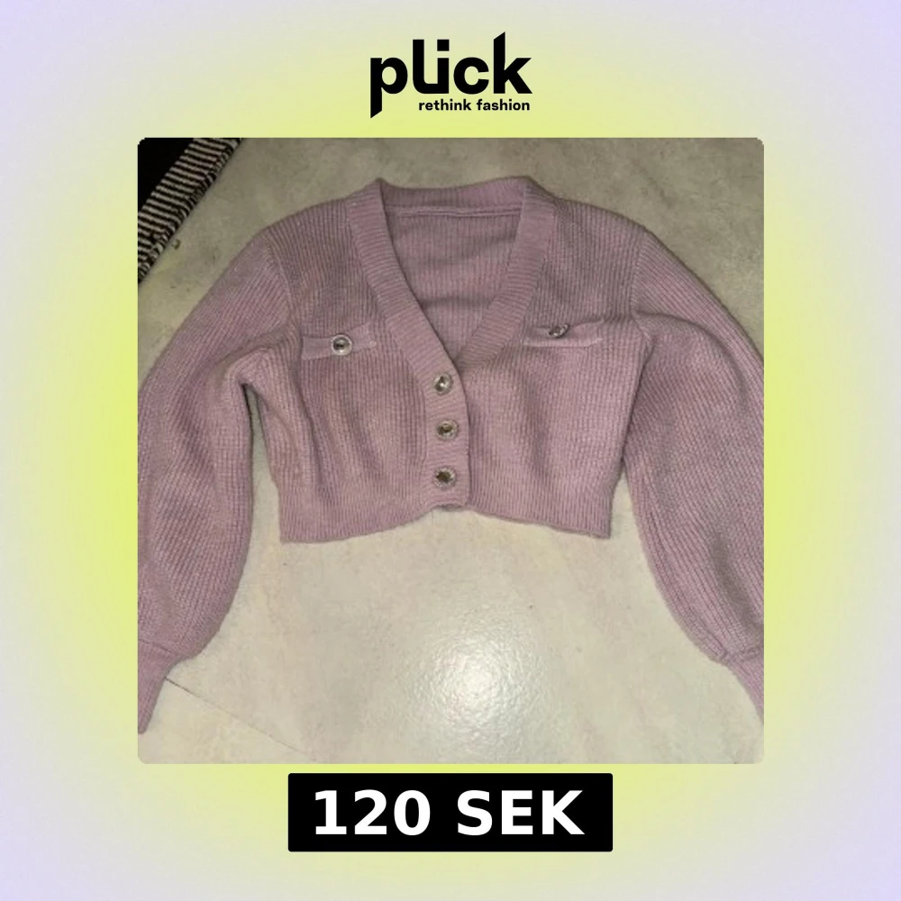 Säljer en söt lila stickad kofta med glittriga knappar framtill. Koftan är croppad och har långa ärmar med ribbade muddar. Perfekt för att lägga till lite glitter i vardagen!