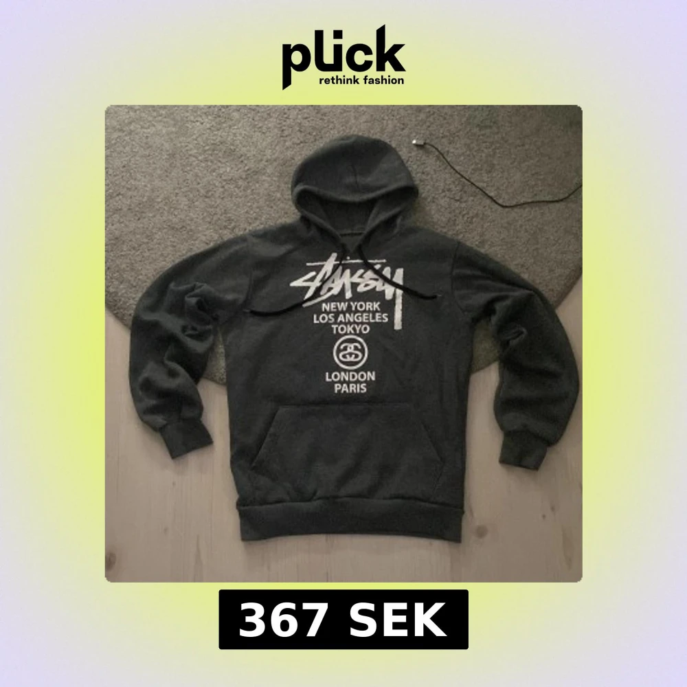 Säljer en svart hoodie från Stussy med vit logga och tryck på bröstet med städer som New York, Los Angeles, Tokyo, London och Paris. Klassisk känguruficka och huva med snörning. Perfekt för dig som gillar streetwear och vill sticka ut.