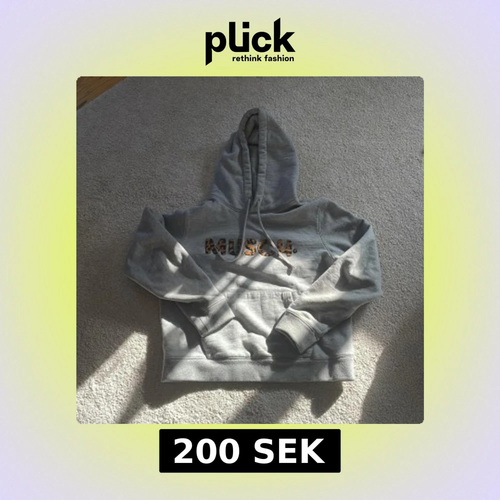 Säljer en grå hoodie från Musch med leopardmönstrad text på bröstet. Mycket bra sick