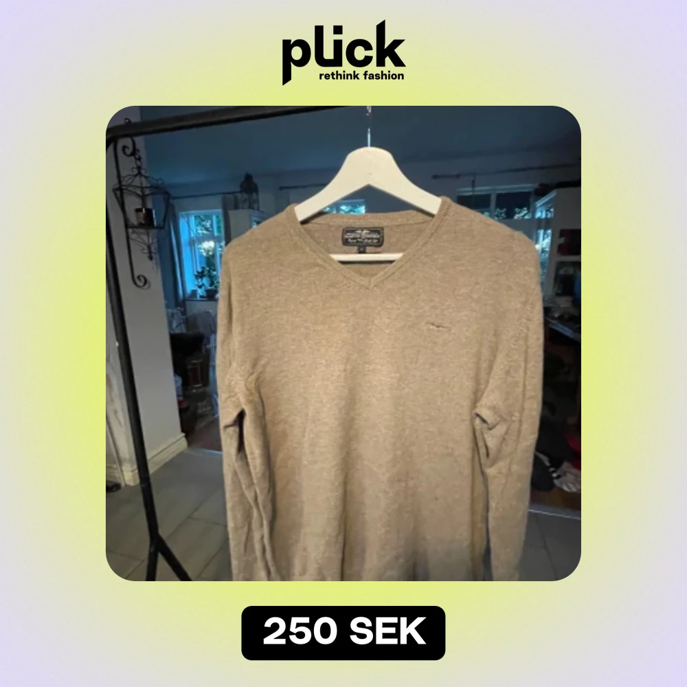 En beige tröja från Hampton Republic i storlek M. Tröjan har en v-ringad hals och är tillverkad av bomull. Den har långa ärmar och ribbstickade muddar vid ärmslut och nederkant.