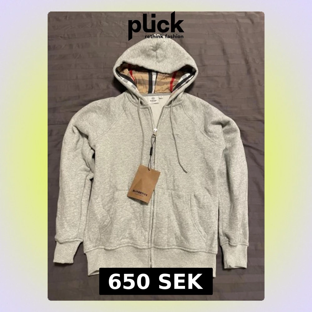Snygg grå hoodie från Burberry med klassiskt rutigt foder i huvan och broderad logga på bröstet. Tröjan har dragkedja, snörning i huvan och två fickor framtill. Perfekt för dig som gillar stilrena och exklusiva plagg.