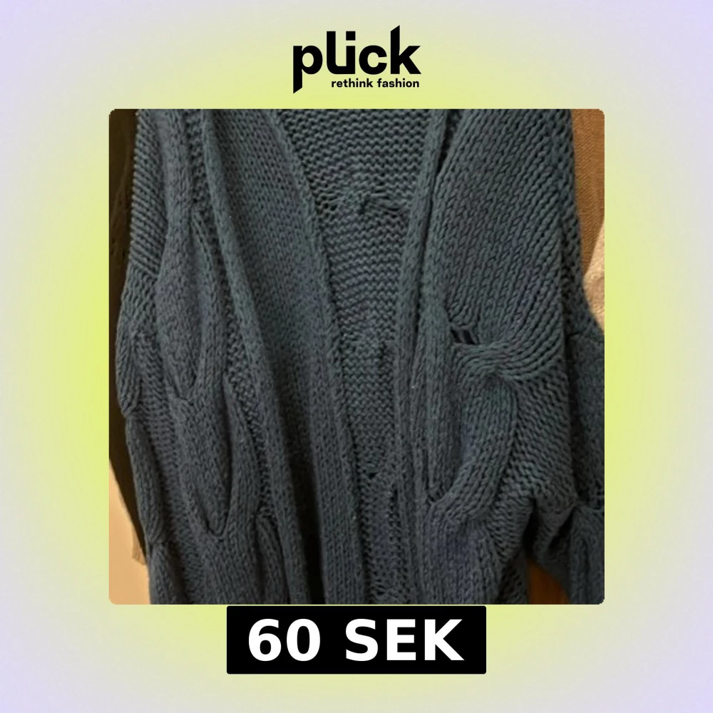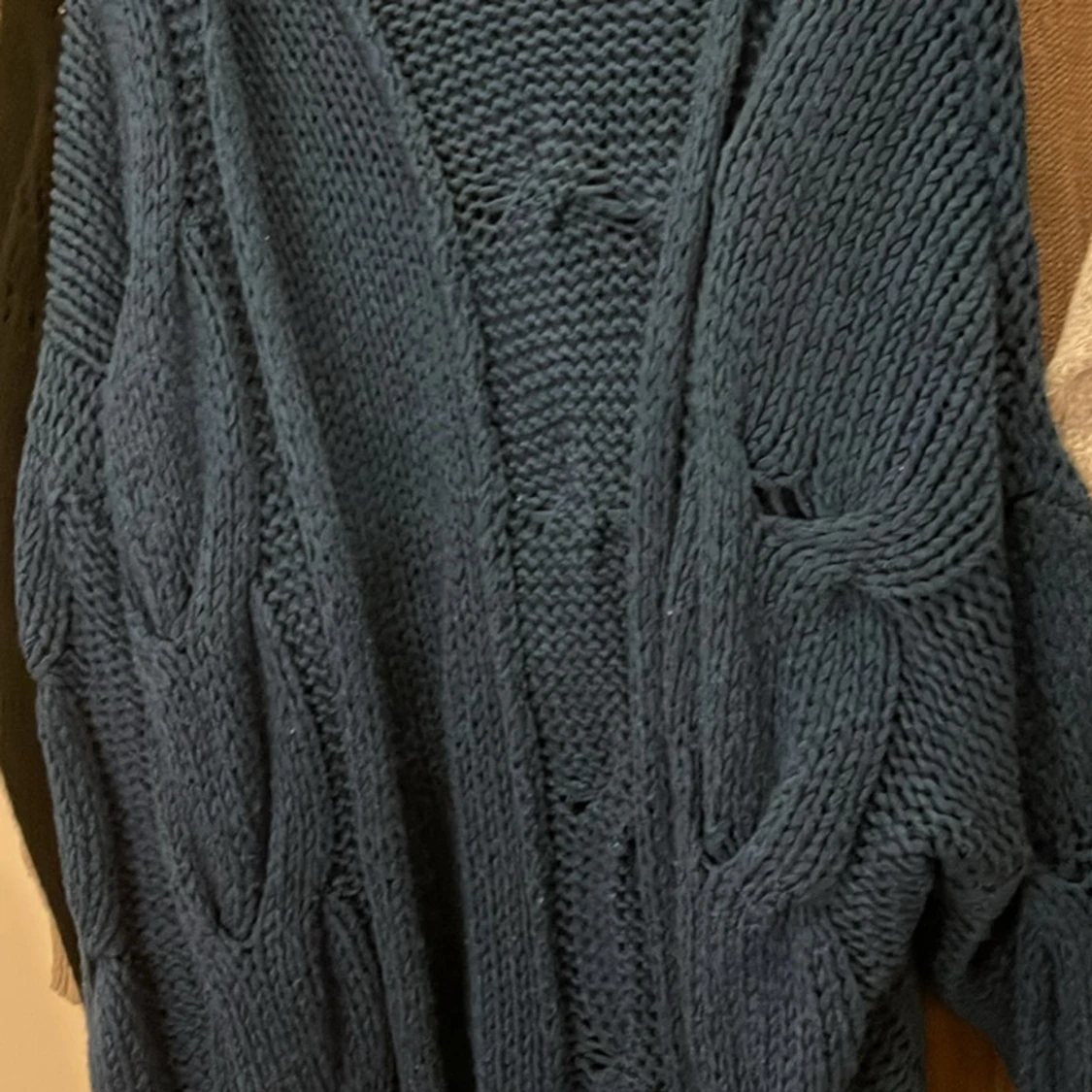 Säljer en chunky mörkblå stickad kofta med grova kabelstickade detaljer. Koftan har en öppen front och är perfekt för att slänga över en t-shirt när det är kyligt. Den har lång ärm och en mysig, oversized känsla.