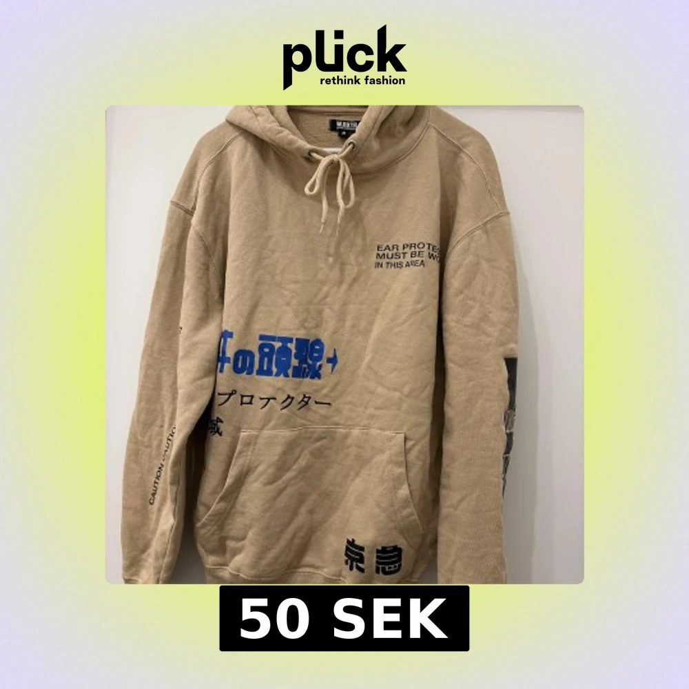 Säljer en beige hoodie från William Baxter med coola japanska och engelska tryck i blått och svart. Tröjan har huva med snörning, känguruficka och långa ärmar. Perfekt för dig som gillar streetwear och unika detaljer.