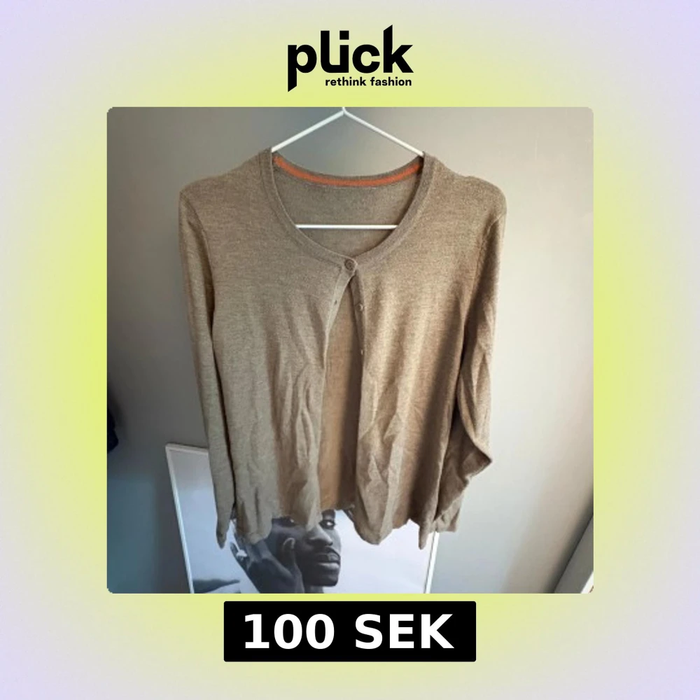 Säljer en enkel och stilren beige kofta med rund halsringning och knäppning framtill. Koftan har långa ärmar och är tillverkad i ett mjukt, tunt material som passar perfekt för lager-på-lager. Skulle säga den sitter som en M