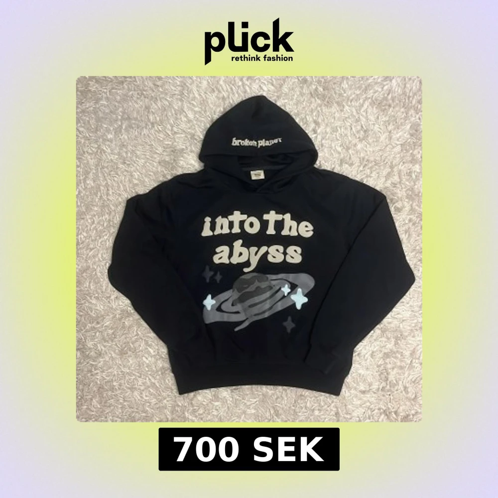 Cool svart hoodie från Broken Planet med trycket 'into the abyss' och ett planetmotiv framtill. Hoodien har huva och ribbade muddar samt texten 'BROKEN' broderad på ärmen. Perfekt för dig som gillar streetwear och unika prints.