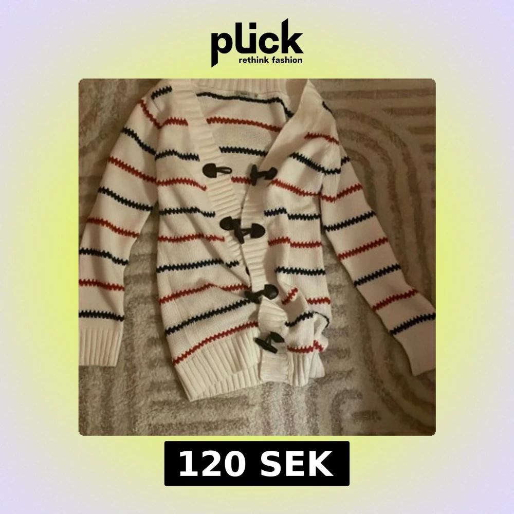 Säljer en mysig vit kofta från Rut m.fl. med ränder i rött och svart. Koftan har långa ärmar och stängs med dekorativa knappar framtill. Perfekt för en avslappnad stil. (OBS! Den är förstor för mig)