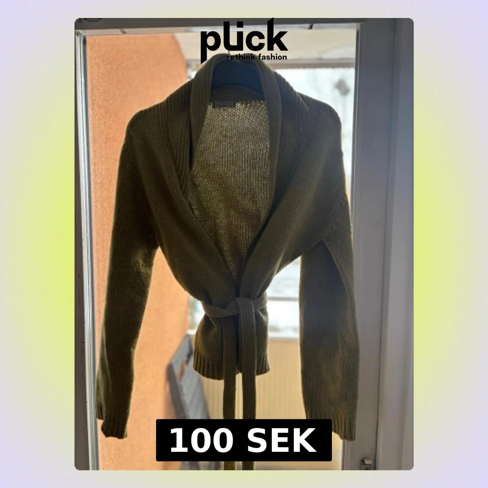 Säljer en olivgrön stickad omlottkofta med bred krage och långa ärmar. Koftan har ett matchande knytband i midjan och är gjord i mjukt, ribbstickat material. Perfekt för lager på lager och en avslappnad stil.