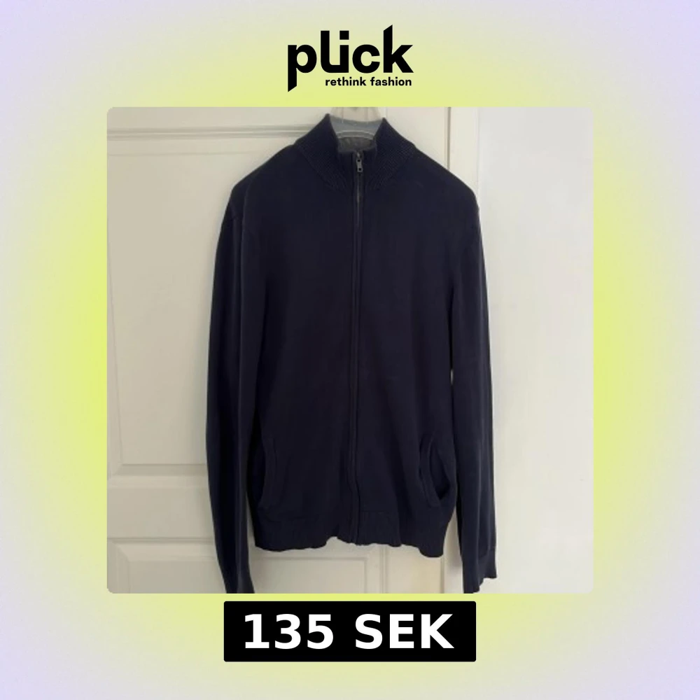 Snygg mörkblå kofta med hel dragkedja och ribbad krage. Tröjan har två fickor framtill och långa ärmar. Perfekt för dig som gillar enkel och stilren design. Passar till både jeans och mjukisbyxor.