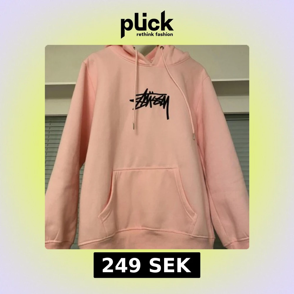 Säljer en snygg rosa hoodie från Stüssy med deras ikoniska logga i svart på bröstet. Hoodien har en stor ficka framtill och justerbar dragsko i huvan. Perfekt för en avslappnad stil!