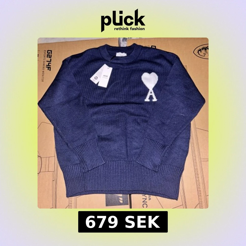 Jätte fin tröja som är mörkblå och har ett vitt märke vid sidan där framme. Den är jätte skön och ha på sig. Pris kan diskuteras