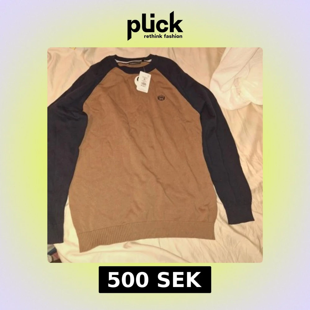 Snygg brun tröja från Catmandoo med marinblå ärmar och detaljer. Tröjan har rund halsringning med vit rand och ett broderat CMD-emblem på bröstet. Perfekt för dig som gillar stilren och sportig look.