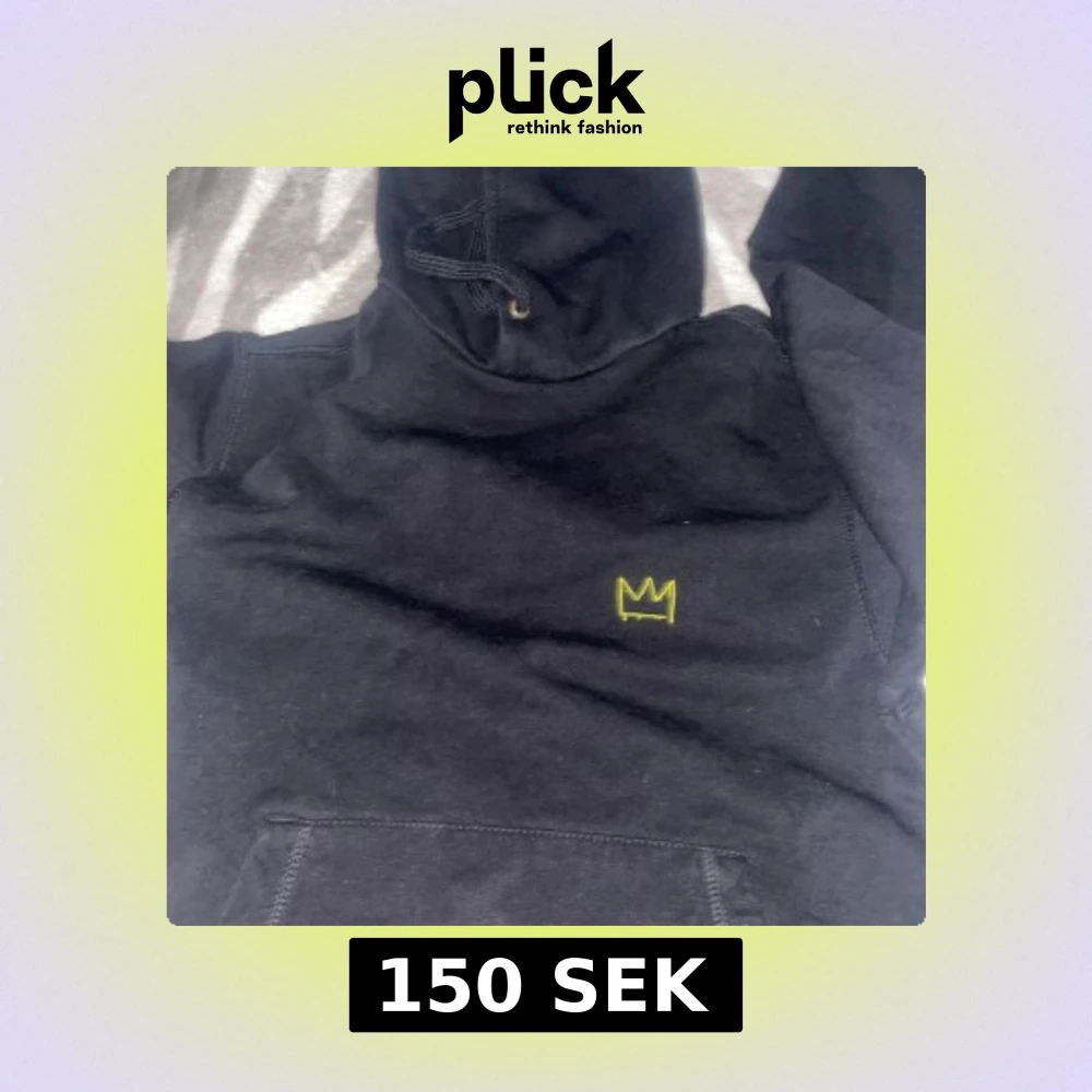 Svart hoodie från Lucille med gul krona broderad på bröstet och unik mindmap-tryck i gult och lila på ryggen. Tröjan har huva med snörning och en stor magficka. Perfekt för dig som gillar streetwear och coola detaljer.