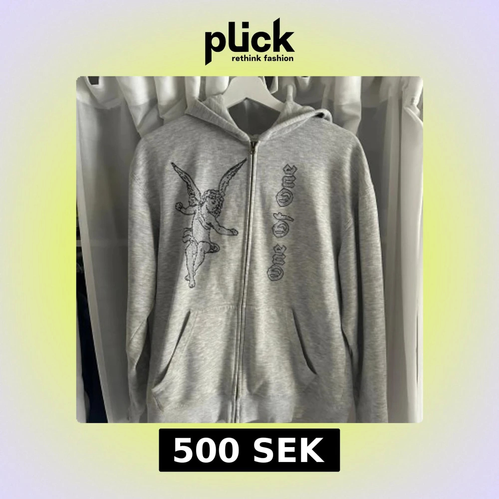 Grå zip-hoodie med huva och fickor framtill. På bröstet finns ett tryck av en ängel och texten 'One of One' i svart. Hoodien har en avslappnad passform och är tillverkad i mjukt bomullsmaterial. Perfekt för dig som gillar streetwear med unik design.