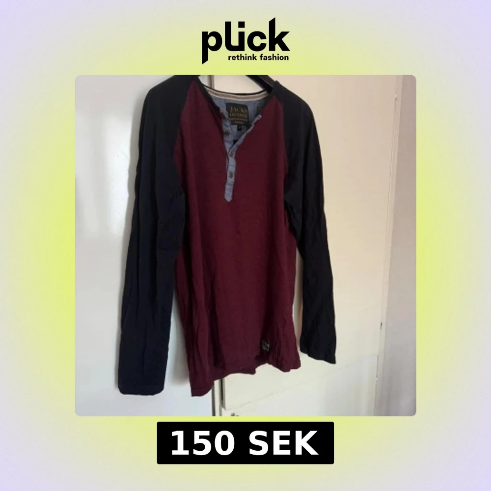 Säljer en vinröd och svart långärmad tröja från Jacks Denim Co. Tröjan har en knappslå i grått med tre knappar och ett diskret randigt mönster. Perfekt för en avslappnad stil.