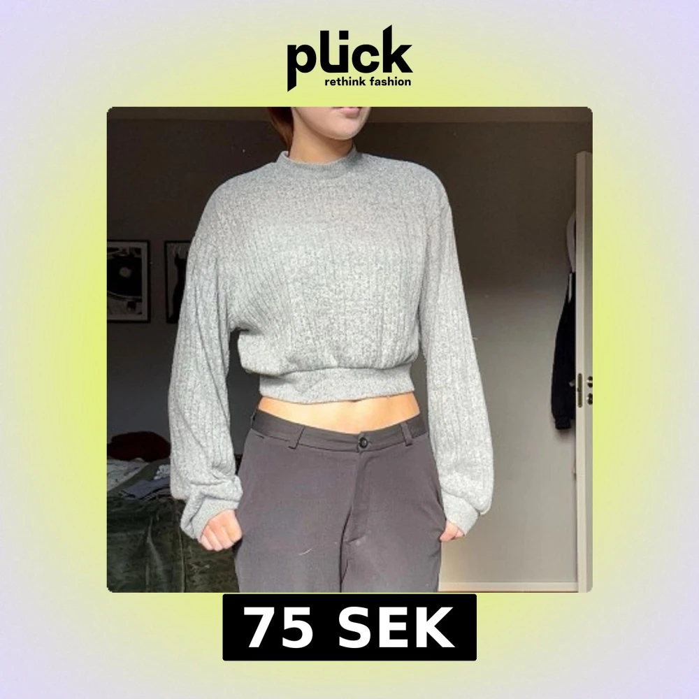 Säljer en stilren grå ribbad tröja med croppad passform. Tröjan har långa ärmar och en hög halsringning, perfekt för en avslappnad look. Passar bra till både jeans och kjol.
