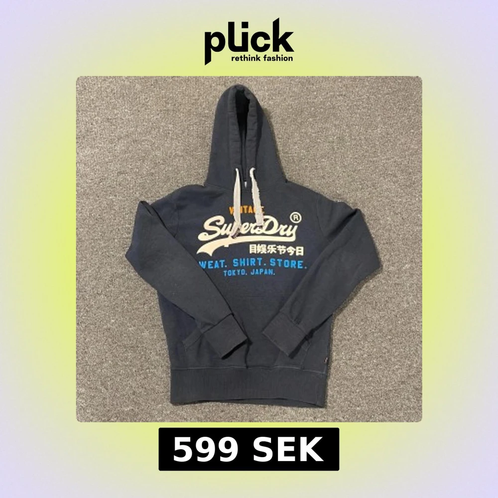 Tja! Säljer en mörkblå hoodie från SuperDry med tryck i vitt, orange och blått på framsidan. Hoodien har en klassisk design. Perfekt för en avslappnad stil. Skick 9/10 Tveka inte med frågor!🙌