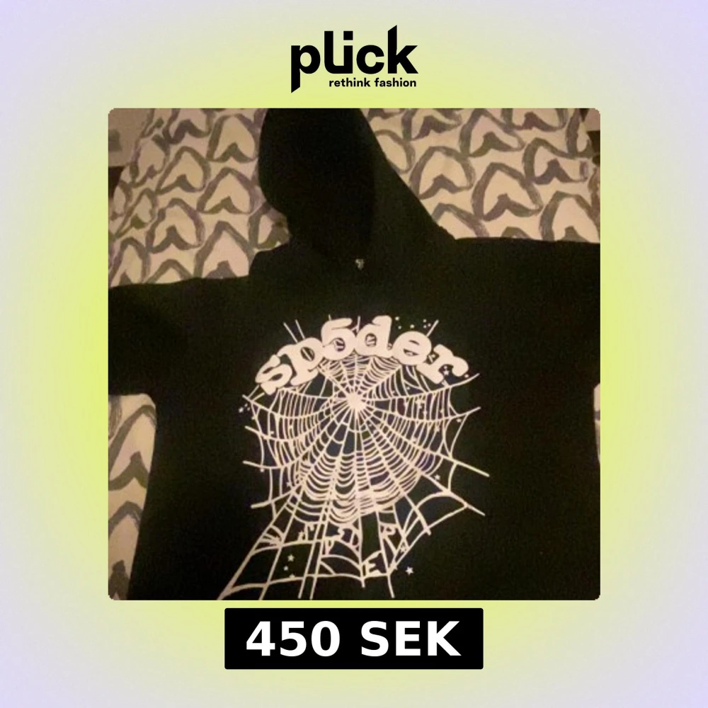 Säljer en svart hoodie från SP5DER med stort vitt spindelnätsmönster och texten 'sp5der' på framsidan. Tröjan har huva och långa ärmar, perfekt för dig som gillar streetwear och unika tryck.