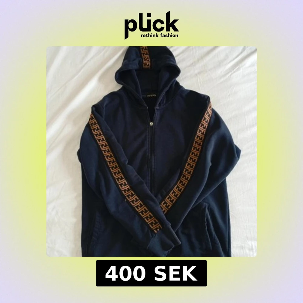 Snygg mörkblå hoodie från FJ Fendi med dragkedja och huva. Tröjan har bruna och svarta logoband längs ärmarna och över huvan, vilket ger en riktigt trendig look. Perfekt för dig som gillar streetstyle och vill sticka ut lite extra.