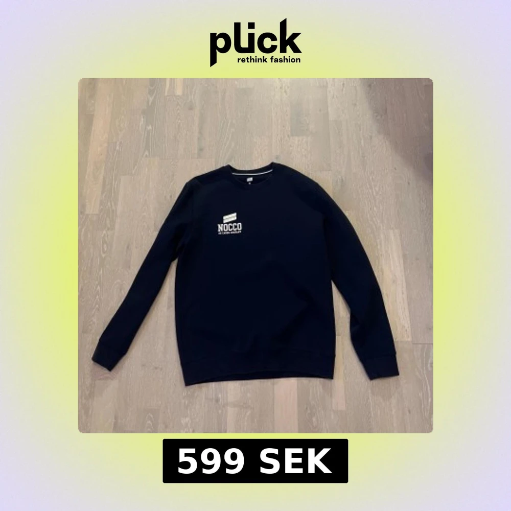 Säljer en mörkblå sweatshirt från NOCCO med vit logga tryckt på både bröstet och ryggen. Tröjan har rund hals, långa ärmar och är tillverkad i mjukt material som passar perfekt för en chill stil.