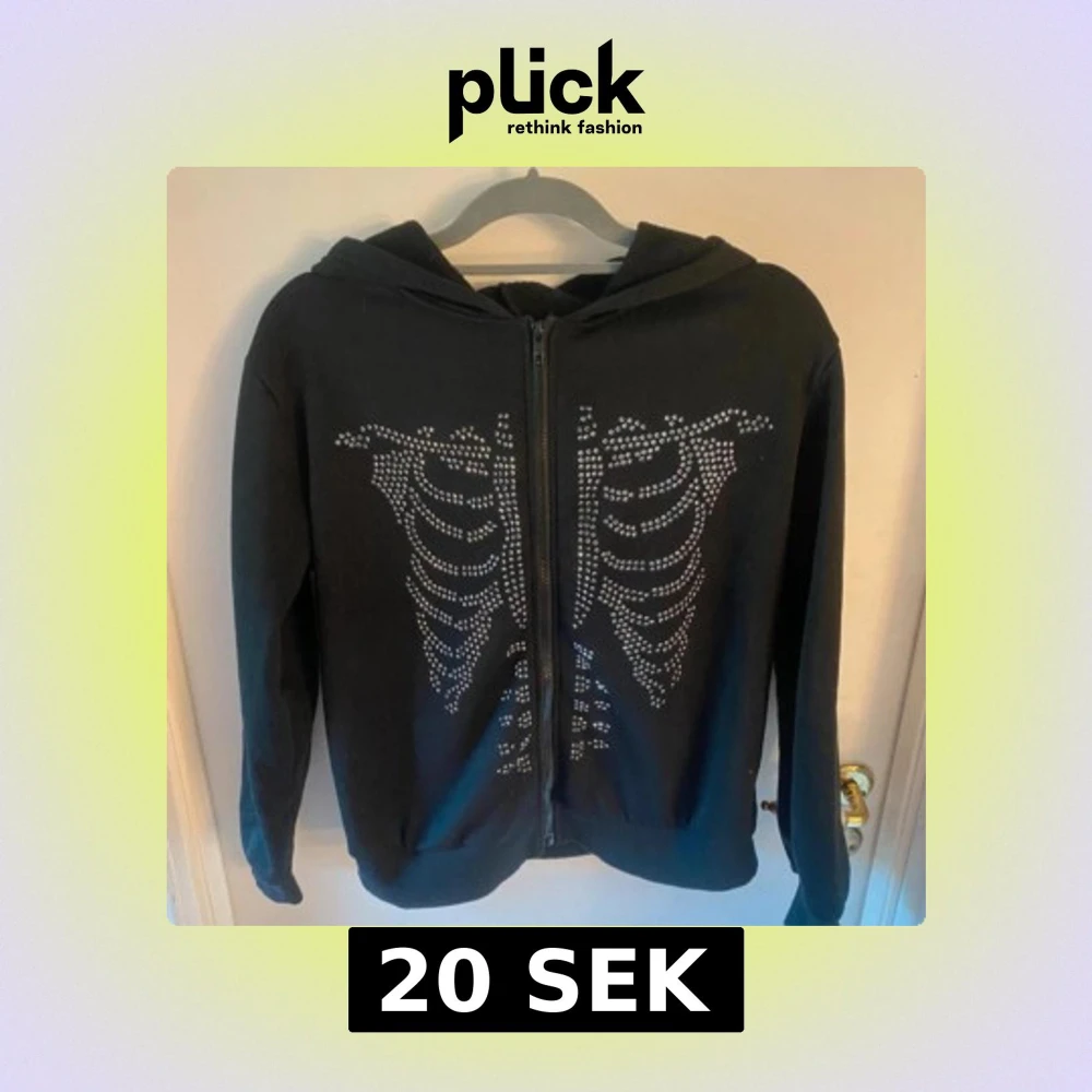 Svart hoodie med dragkedja och huva. Framsidan har ett coolt skelettmönster i silvriga nitar som ger en edgy vibe. Perfekt för dig som gillar unika detaljer och streetstyle. Långärmad och skön att bära.