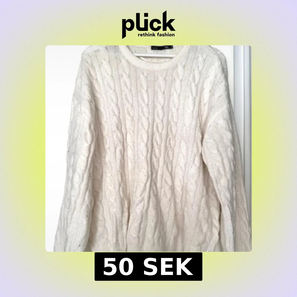 Mysig vit kabelstickad tröja från 157 med rund halsringning. Tröjan har ett klassiskt flätmönster och långa ärmar, perfekt för kyliga dagar. Passar dig som gillar en enkel och stilren look.
