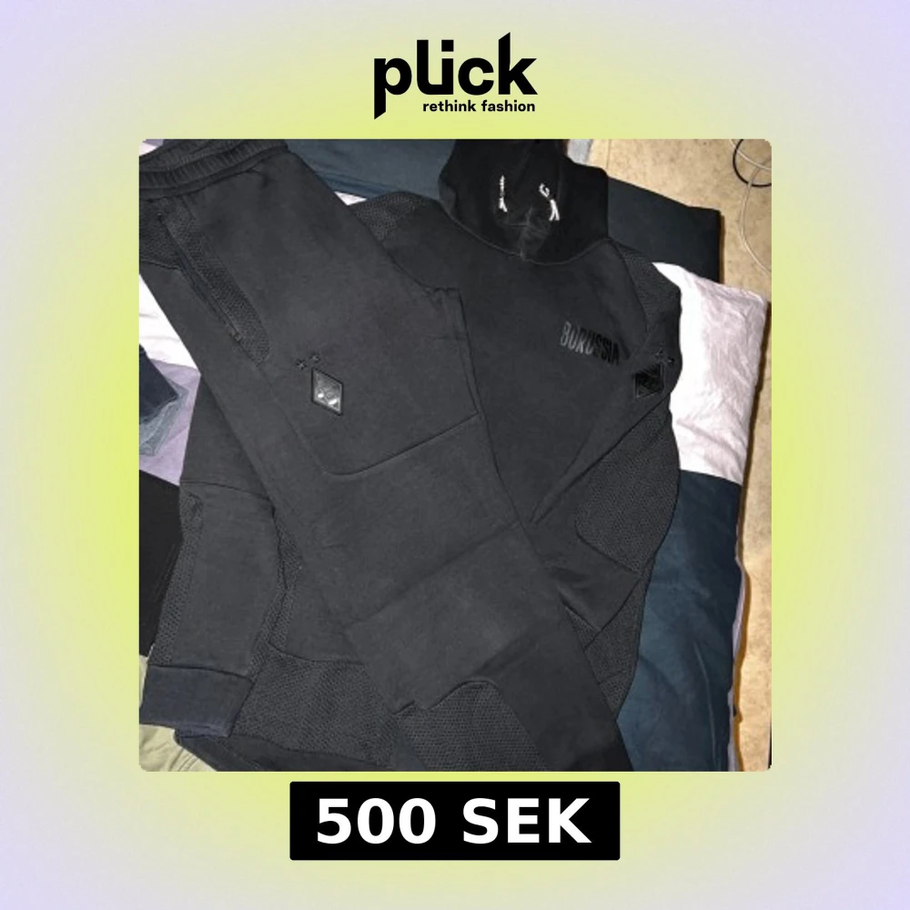 Säljer en svart hoodie och byxa från Borussia med diskret logga på bröstet och huva med snörning. Tröjan har långa ärmar och sportig design, perfekt för dig som gillar en stilren look.