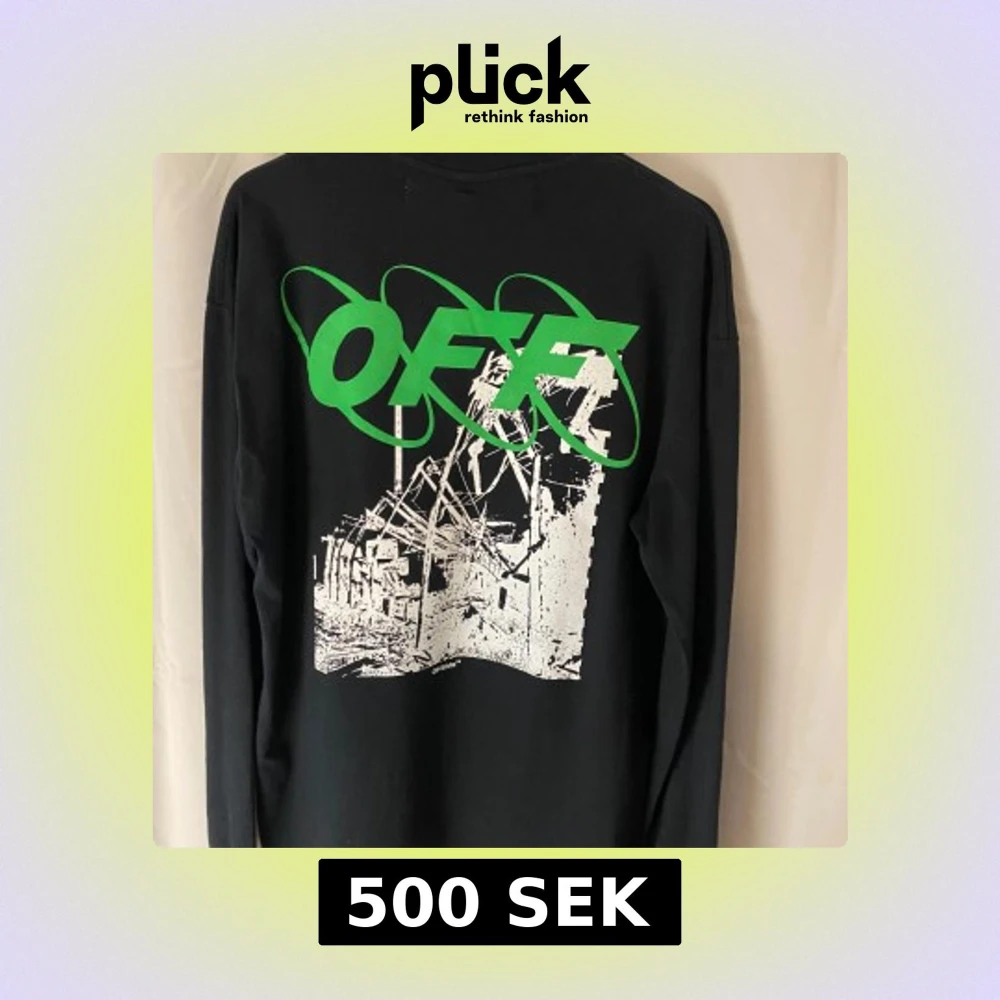 Säljer en svart långärmad tröja från Off-White med tryck både fram och bak. Framsidan har texten 'Fall-winter 19-20' och ett grafiskt motiv. Baksidan pryds av ett stort grönt 'OFF' med ett liknande motiv. Perfekt för dig som gillar streetwear!