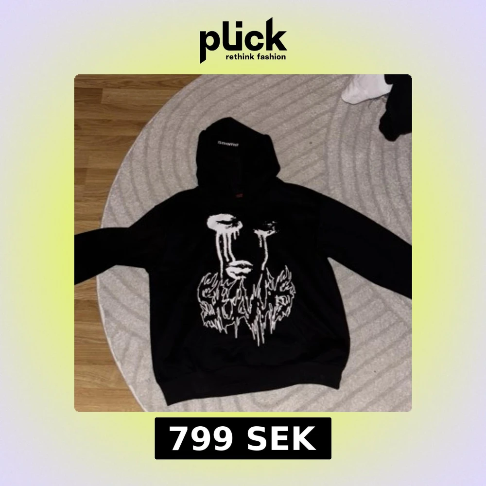 Svart hoodie från Seams med stor vit grafisk ansiktstryck på framsidan och broderad logga på huvan. Klassisk känguruficka och mjukt material som känns skönt mot huden. Perfekt för dig som gillar streetwear och unika prints.