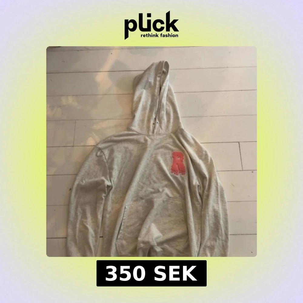 Snygg grå hoodie med huva och en rosa patch med drip-effekt på bröstet. Tröjan har en klassisk känguruficka framtill och långa ärmar. Perfekt för chill dagar och streetwear-stil. Knappt använd