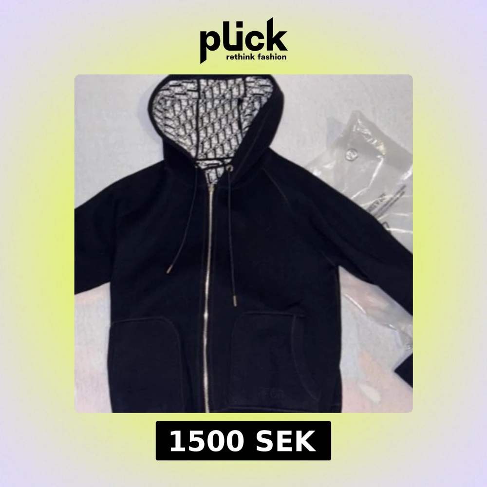 Svart hoodie med dragkedja och huva. Insidan av huvan har ett vitt och svart monogram. Tröjan har två stora fickor framtill och broderad -logga på ena fickan. Snygg och stilren design, perfekt för dig som gillar exklusiva streetwear-plagg.