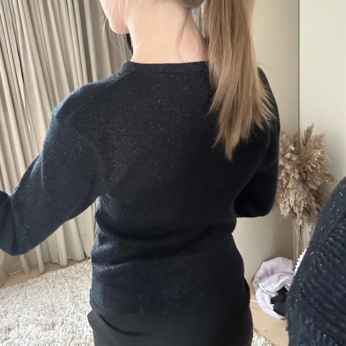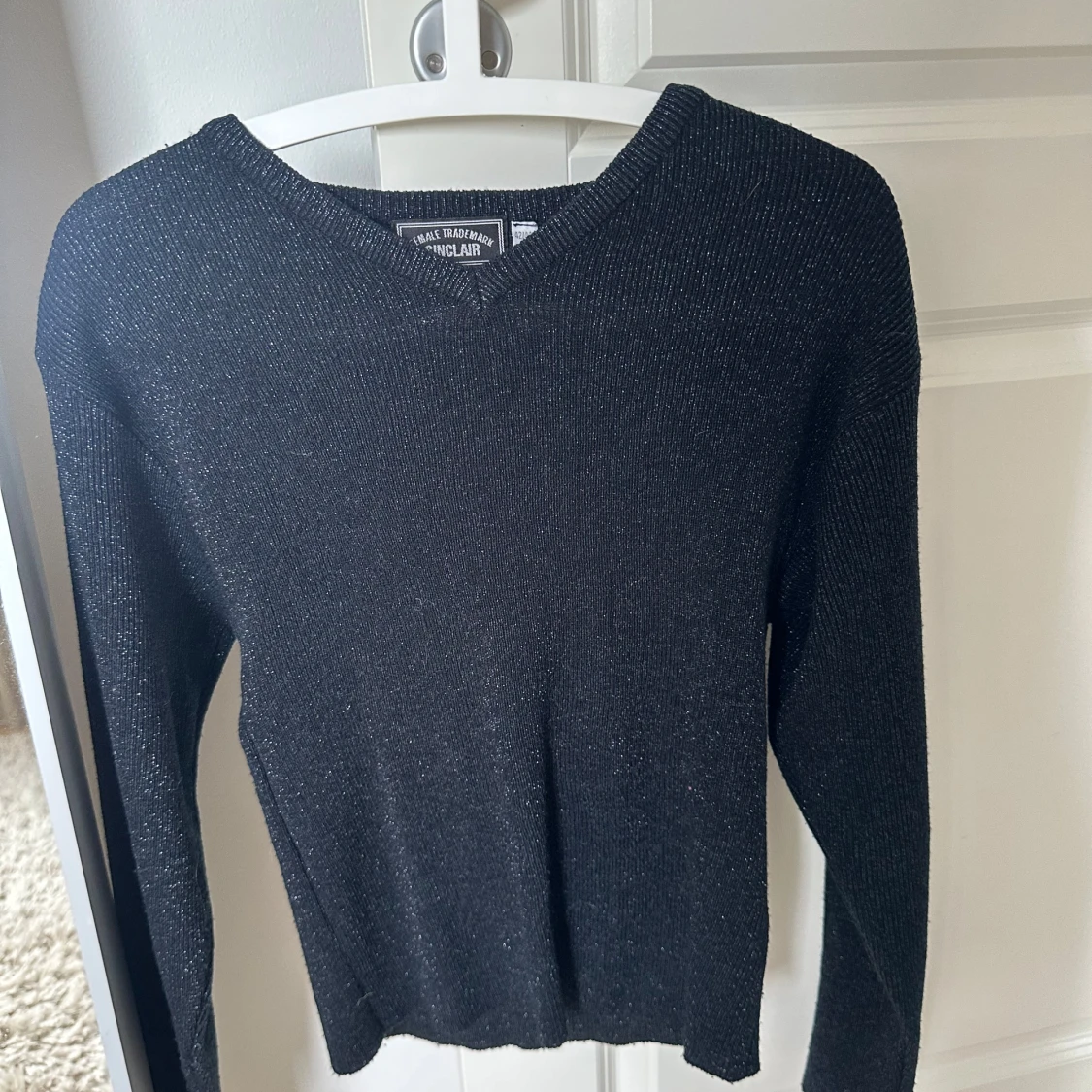 Svart stickad tröja från Sinclair med diskret glittrigt garn. V-ringad halsringning och långärmad modell. Snygg passform som sitter normalt på kroppen, perfekt till jeans eller kjol. Materialet är mjukt och stretchigt för extra komfort.
