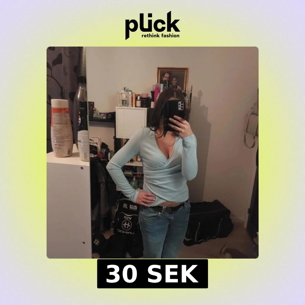 Säljer en stilren ljusblå omlottopp med långa ärmar. Toppen har en v-ringad design och är perfekt för en chic look. Passar bra till jeans eller kjol.