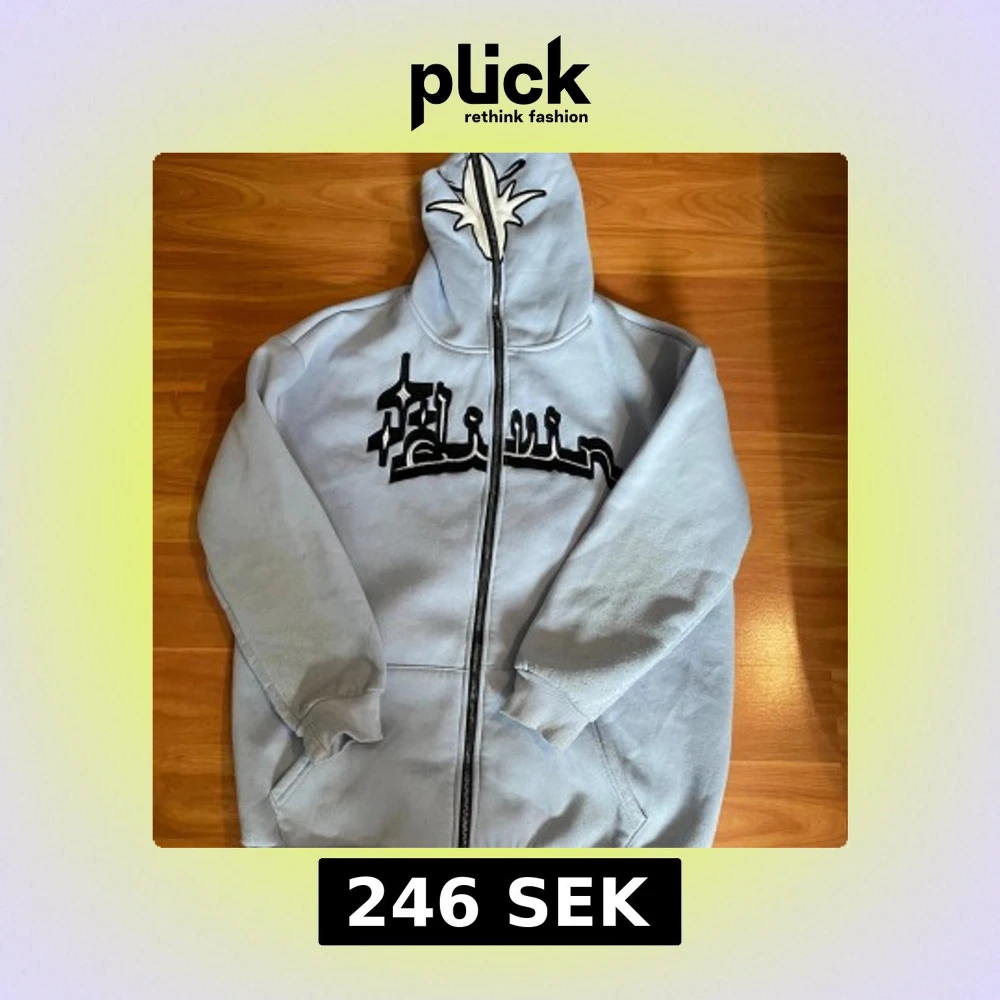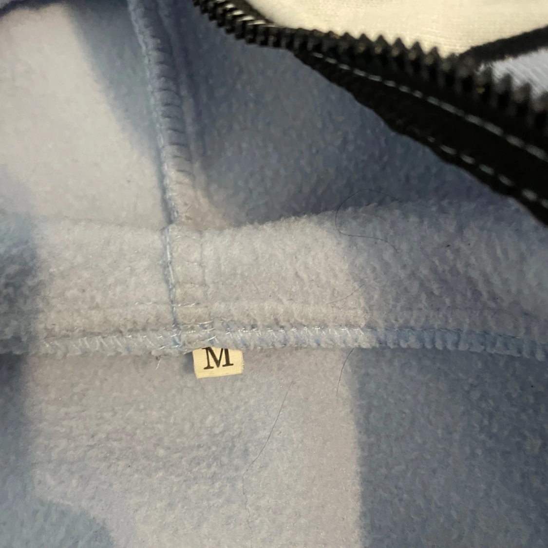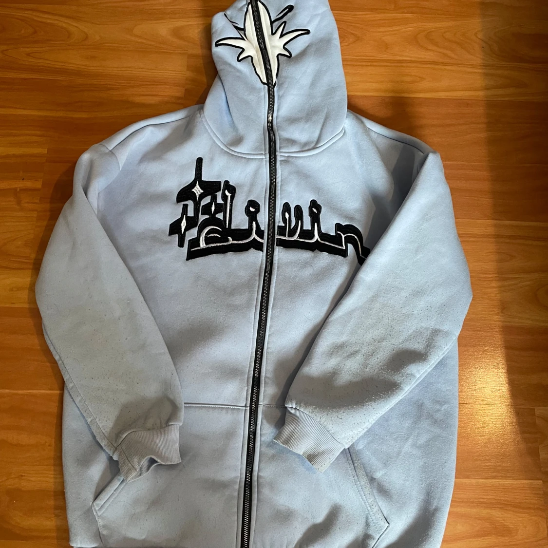 Säljer en ljusblå hoodie i fleece med svart och vitt tryck framtill och unik stjärndetalj på huvan. Tröjan har dragkedja hela vägen, fickor och ribbade muddar. Perfekt för dig som gillar streetwear och vill sticka ut.