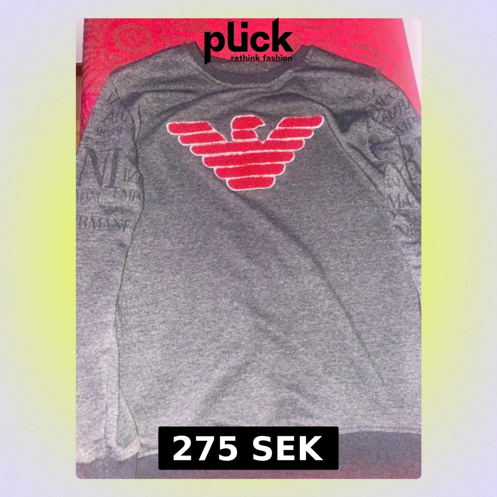 Snygg grå sweatshirt från Emporio Armani med stort rött broderat örnlogo på bröstet och tryckt text på ärmarna. Tröjan har rund hals och långa ärmar, tillverkad i mjuk bomullsmix som är skön mot huden. Perfekt för dig som gillar stilrena designer med en twist.