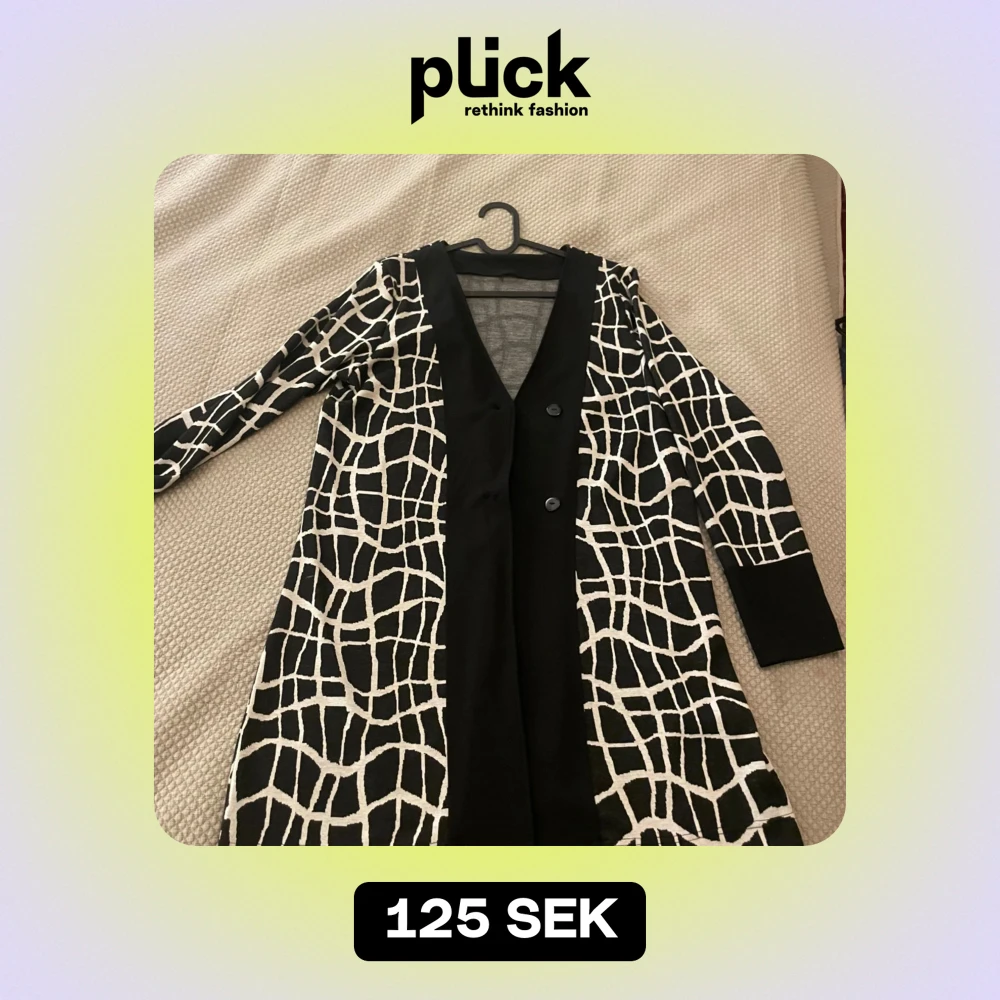 Säljer en snygg svart och vit kappa från Jensen med ett unikt rutigt mönster. Den har långa ärmar och knappar framtill. Perfekt som julklapp.