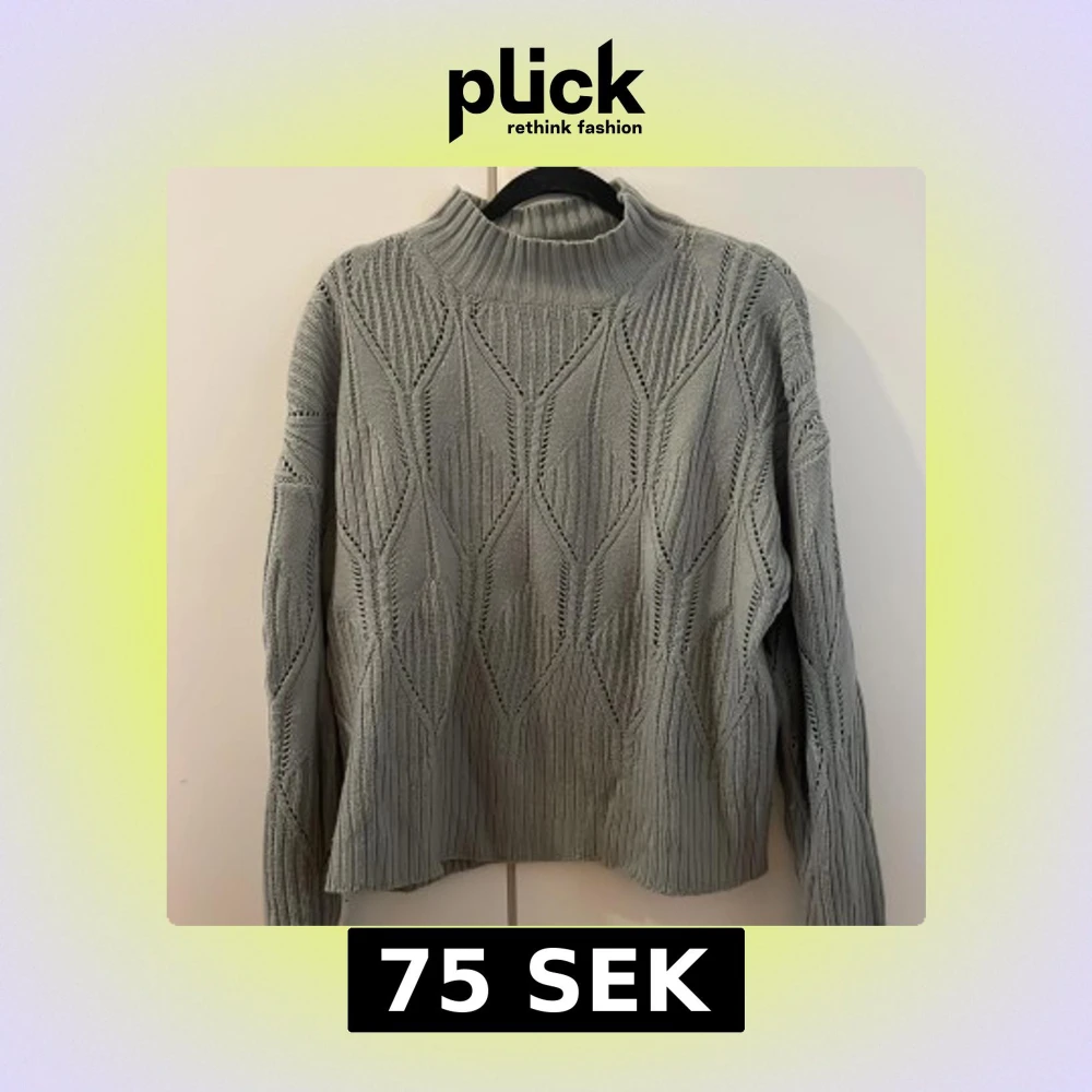 Snygg grågrön stickad tröja från SHEIN i storlek M. Tröjan har ett coolt grafiskt mönster, ribbad hög krage och långa ärmar. Perfekt för lager-på-lager och passar till både jeans och kjol. Materialet är mjukt i 100% akryl.