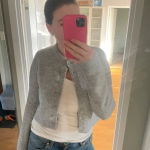 Säljer en mysig grå kofta från FB Sister Knitwear. Den är stickad med knappar framtill och har långa ärmar. Perfekt för kyligare dagar. 🩶