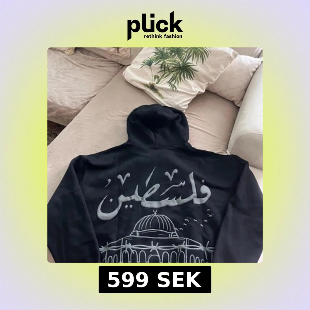 Snygg svart hoodie med ett stort tryck på ryggen som mosken i Jerusalem och text i arabisk kalligrafi. OBS! Enbart intressekoll för tillfället!