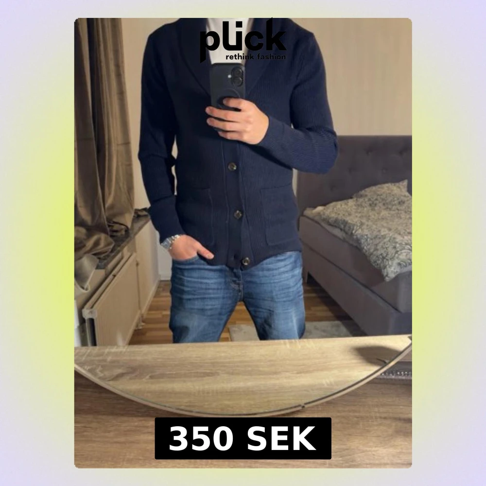 Säljer en mörkblå cardigan med sjalkrage och stora knappar framtill. Cardiganen har två fickor och är ribbstickad för en snygg struktur. Perfekt att slänga över en t-shirt för en avslappnad men stilren stil. Har bara haft på mig den 2 gånger.