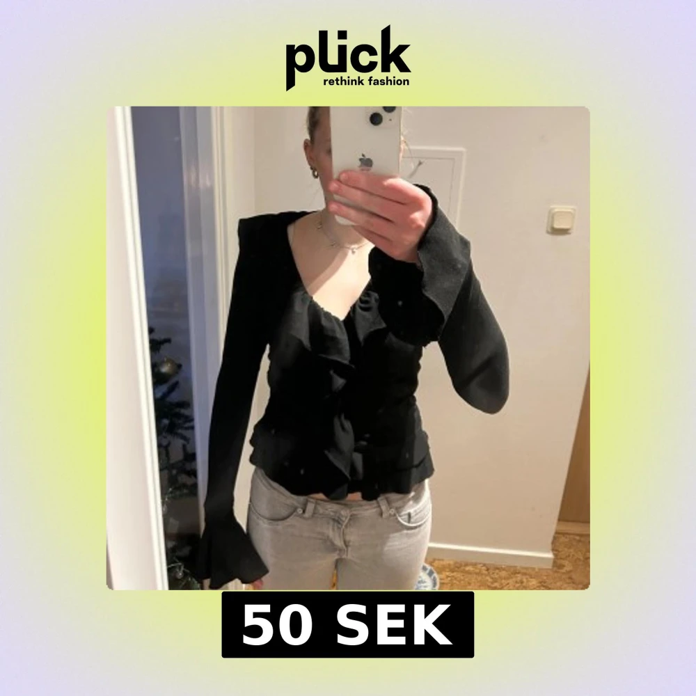Säljer en svart blus med volangdetaljer och långa ärmar. Blusen har en v-ringad design. Perfekt för en stilren look.