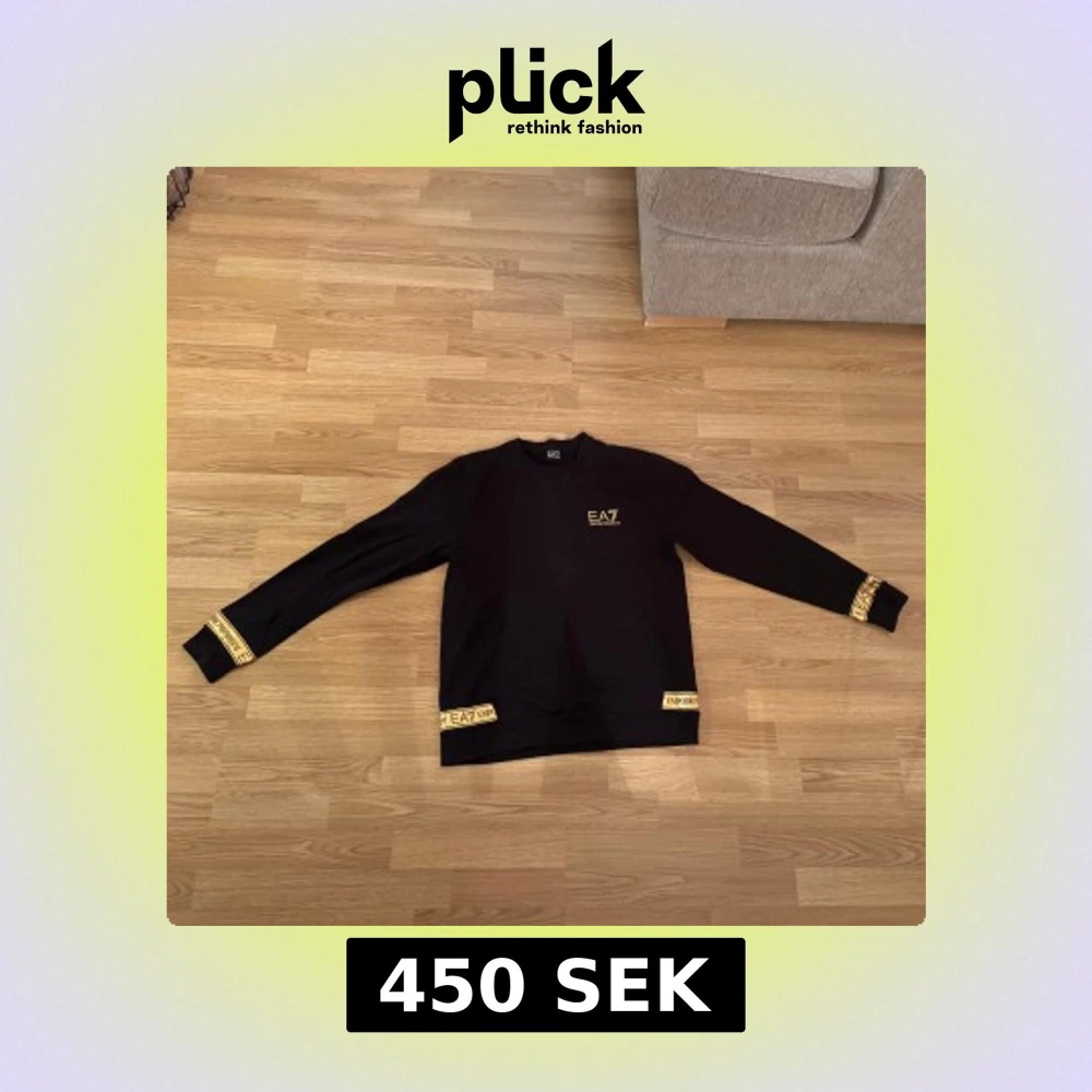 Svart långärmad tröja från EA7 Emporio Armani med guldiga logoband vid ärmslut och nederkant. Tröjan har rund halsringning och en liten EA7-logga på bröstet. Perfekt för dig som gillar stilrena och exklusiva plagg.