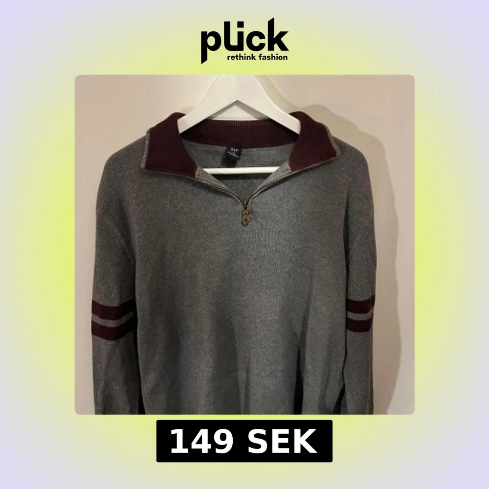Snygg grå tröja från GAP med dragkedja och vinröda detaljer. Tröjan har långa ärmar med två vinröda ränder på ärmarna och en ribbad krage. Perfekt för en stilren och avslappnad look.
