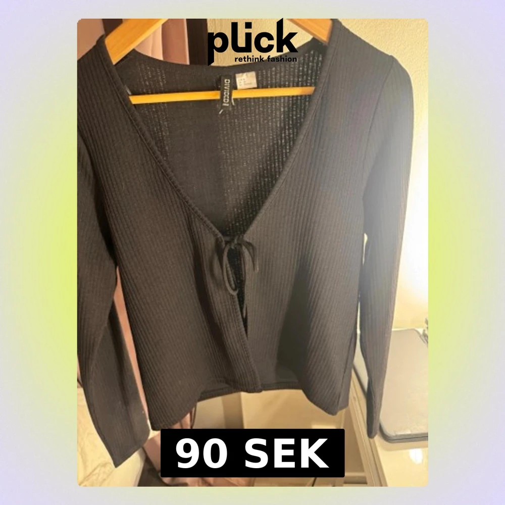 Säljer en svart ribbad kofta med lång ärm och djup V-ringning. Koftan har en snygg knytning framtill och är tillverkad i ett stretchigt material som sitter skönt på kroppen. Perfekt att styla över ett linne eller topp.