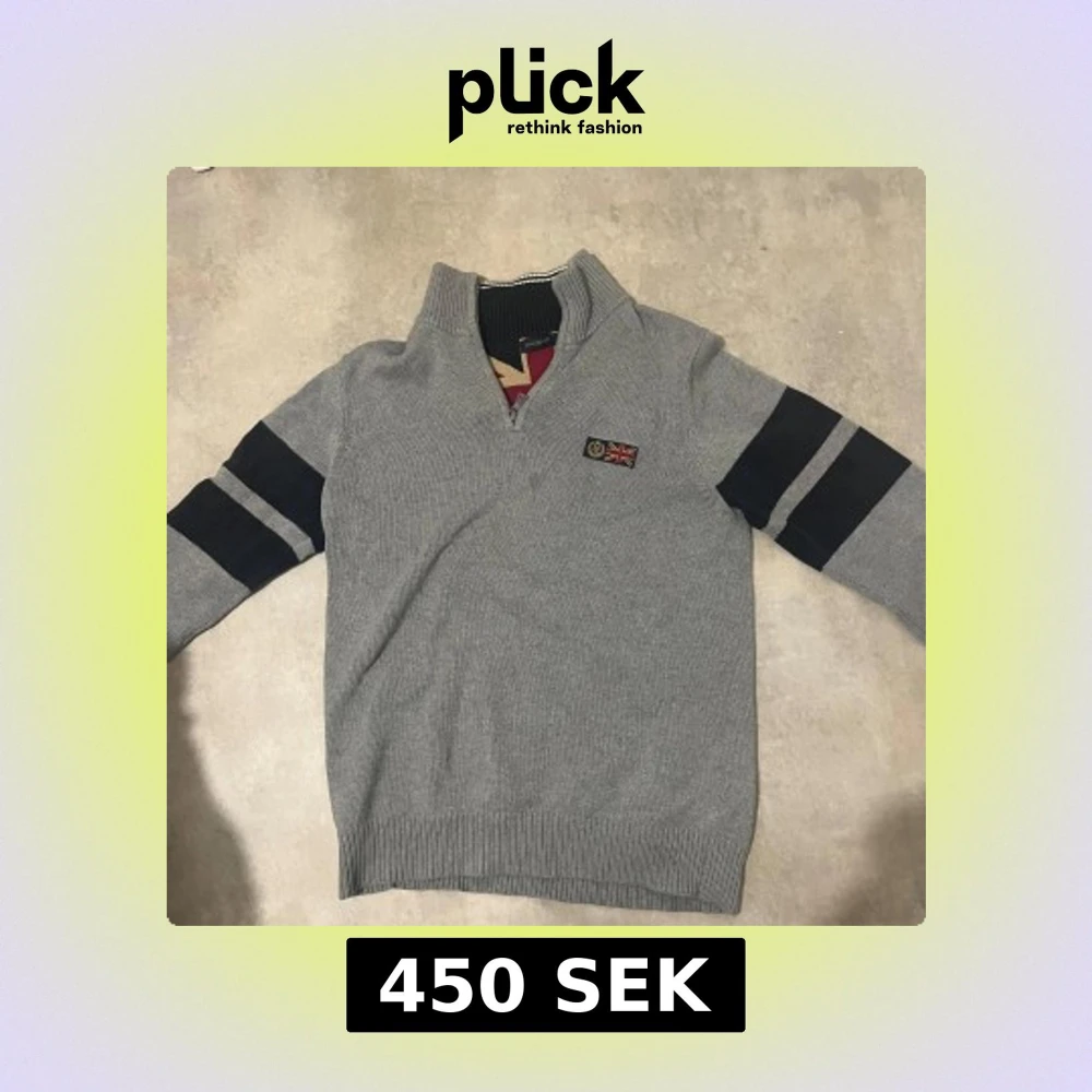 Snygg grå tröja från Henri Lloyd med dragkedja och ribbade muddar. Tröjan har mörkblå ränder på ärmarna och en liten flagga på bröstet. Perfekt för en stilren look.