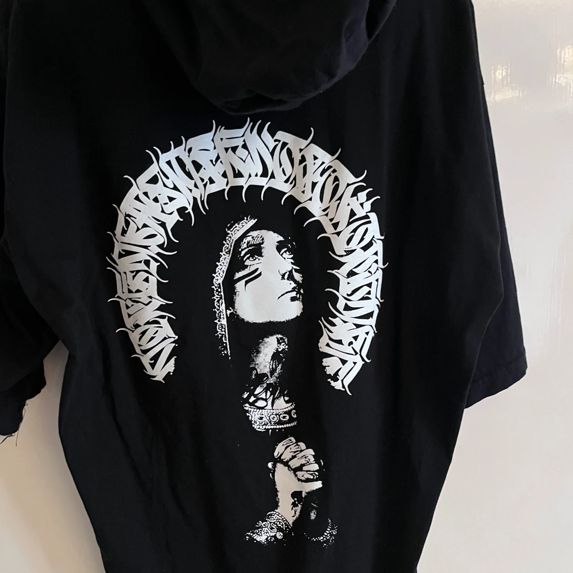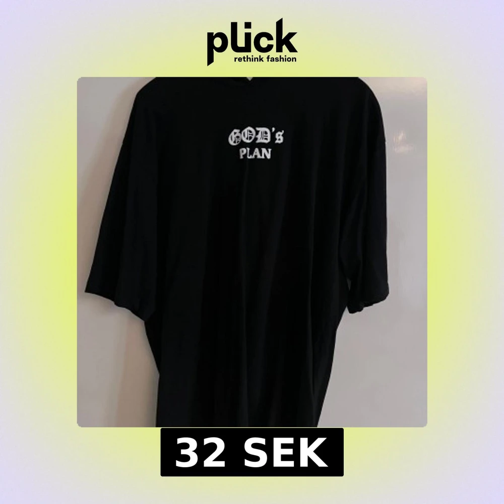 Svart oversized hoodie med vit text 'God's Plan' på bröstet och stor grafisk print på ryggen med motiv av en kvinna och coolt mönster runt. Hoodien har kortare ärmar och är tillverkad i mjuk bomull. Perfekt för dig som gillar streetwear vibes.