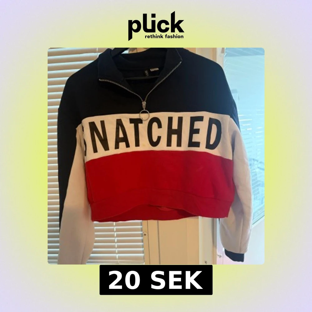 Croppad tröja från H&M i storlek M med texten SNATCHED framtill. Tröjan har färgblock i marinblått, vitt och rött, lång ärm och half zip med cool ringdetalj. Det finns en liten gul fläck i mitten av tröjan.